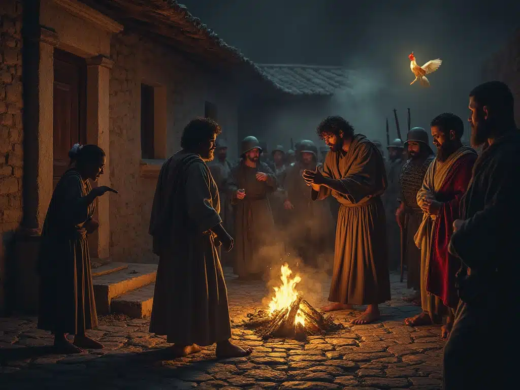 In the tension of the moment, Peter’s heart races as he grapples with his choices. The weight of his denial hangs heavy, a stark contrast to the bond he shares with Jesus. This scene captures the raw emotions of fear and regret that can surface when loyalty is tested.